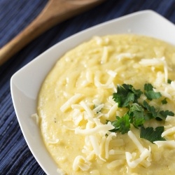 Bring the milk, 2 cups of the water, and a very large pinch of salt to a boil in a medium saucepan. Reduce heat to a low simmer and add cornmeal in a slow and steady stream, constantly whisking to prevent lumps.