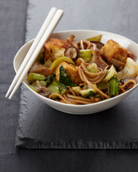Pour off all but 1/4 cup of the oil and return the wok to high heat. Add the mushrooms and stir-fry until lightly browned, about 3 minutes. Add the ginger, garlic and bok choy and stir-fry for 5 minutes. Add the udon and oyster and hoisin sauces and stir-fry for 2 minutes. Add the tofu and toss. Transfer to a bowl and serve.