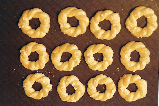 Cool dough really well. Take a piece of dough and roll into long thin strips pencil size ropes, double back and twist to make twisted wreaths. Place on a cookie sheet. Make all wreaths first and keep cool. Then just before baking brush with lightly beaten egg whites and sprinkle on crushed loaf sugar.