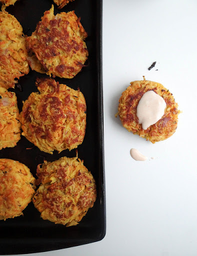 Winter Root Veggie Fritters with Spicy Vegan Aioli