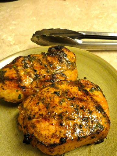 Remove pork from grill, and cover with foil and let rest for 5 minutes. Dress the pork chops with Citrus Cilantro Vinaigrette and serve with rice and beans.