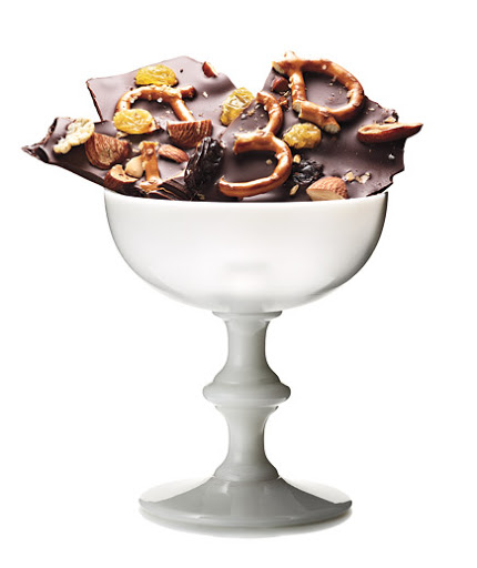 Mentioned in a dessert article January 2014 Real Simple: Use pretzels, chopped nuts, crunchy cereal, and raisins for a sweet and salty chocolate treat.