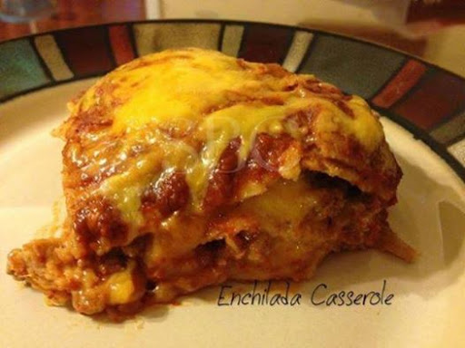 Sprinkle some cheese over tortilla layer. Spread half of the meat over the cheese layer along with half of olives. Repeat layer. Cover top with dipped tortillas. Pour remaining sauce over the top and spread, making sure to get it down the sides. Sprinkle remaining cheese on top.