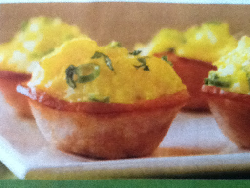 Preheat oven to 3375 F. Very lightly grease a 12-cup mini-muffin pan. Line each cup with a slice of Canadian bacon. On the stovetop, steam cauliflower until very soft. Transfer cauliflower to a bowl and mash it. Add sour cream, parsley, green onion, and salt and pepper to taste, and mix well.