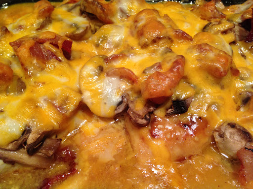 Apply the honey mustard to each breast, then layer with mushrooms, bacon, and shredded cheese.