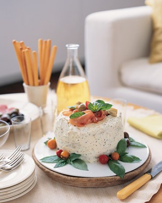 Using store-bought ingredients makes this cake a cinch to prepare. The pestos, tapenade, peppers, and artichokes can be found at a local gourmet food shop or in the prepared-foods section of your supermarket. You may substitute more basil pesto for the artichoke-lemon pesto, if desired.