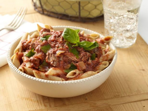 Remove the basil sprig from the sauce and stir in 1/4 teaspoon salt. Gently break up the meat cubes using a fork by pulling them to the side of the slow cooker (you are not trying to shred the meat, but break it down into smaller pieces). Season with additional salt and pepper. Stir in the torn basil and serve over the pasta.