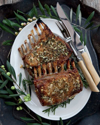 Preheat the oven to 450°. Roast the lamb in the upper third of the oven for 15 minutes. Turn the racks and roast for 10 minutes longer for medium-rare meat. Transfer the racks to a carving board, stand them upright and let rest for 10 minutes.