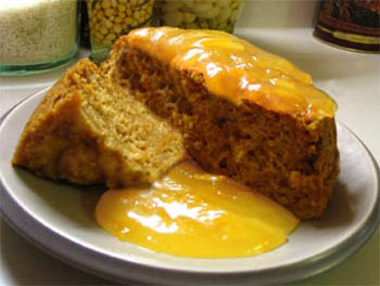 Turn finished pudding out onto a plate and top with the marmalade sauce before serving with custard.