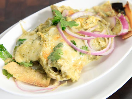 Fill a casserole dish with the crisp tortilla strips and top with half of the cheese. Spread around all of the chicken and creamy sauce, and top with the remaining cheese. Return to the oven and bake the casserole until bubbly brown. Remove and top with sliced red onion rings and more cilantro leaves.