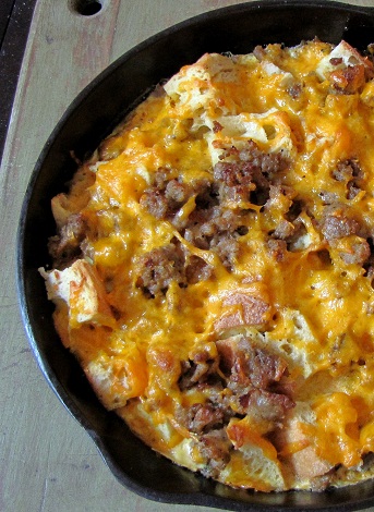 In a large bowl, beat the eggs, milk, half and half, salt/pepper and Worcestershire sauce. Pour this mix over the bread, sausage and cheese in the oven safe skillet. Bake for 25 to 30 minutes when cheese is melted and strata is browned. Serve immediately. You can make this the day before, reserve it in the refrigerator then bake the next day. This method might require a few more minutes of baking. Enjoy!