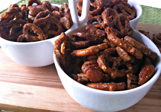 Stir in the pretzels and syrup. Sprinkle the sugar mixture evenly over pretzel and nut mixture and toss gently with tongs or two wooden spoons.
