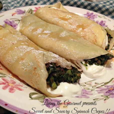 Fill the finished crepe lengthwise with the spinach filling and the sour cream and fold over. Sprinkle with the powdered sugar and drizzle with the honey.