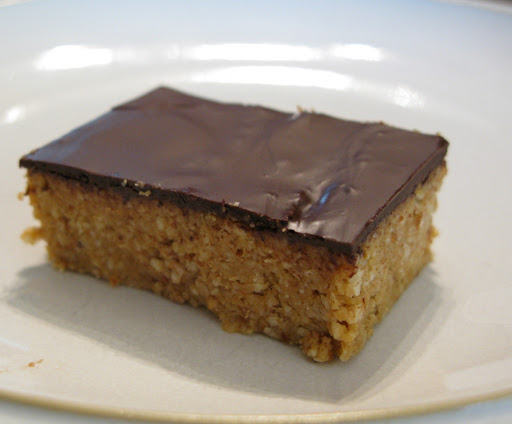 Melt chocolate either in microwave on low power on in a double boiler. Drizzle over almond coconut base and spread with a spoon or rubber spatula until evenly coated. Place bars back in refrigerator for approximately 5 minutes, until chocolate is solid but still a little soft (for ease of cutting). Cut into bars and store in a plastic container in the fridge.