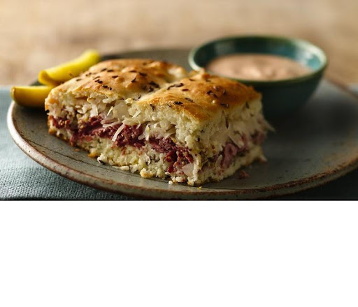 3 Brush corned beef slices with mustard; layer on top of batter in baking dish. Top evenly with cheese and sauerkraut. Carefully spread remaining batter over sauerkraut. Sprinkle with remaining 1 teaspoon caraway seed.