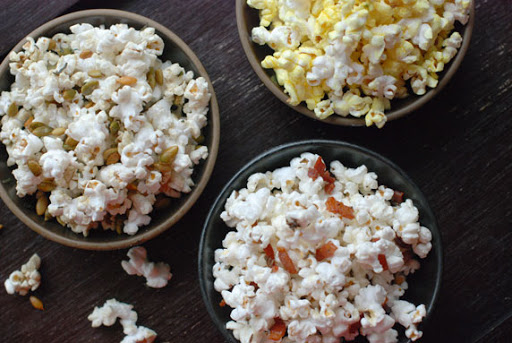 Bacon, Caraway Seeds, Bay Leaf: Slice 2 strips of bacon in thin strips; saute until crisp in popcorn pan. Remove bacon and set aside, leaving drippings in the pan. Pop popcorn in the drippings (yes!) and dump in the bowl. Add 2 tablespoons of butter to pan along with 1 teaspoon of caraway seeds and a bay leaf. Over low heat, toast caraway seeds in butter until fragrant. Discard bay leaf. Add bacon to popcorn, toss with caraway seed butter and salt to taste. Serve with beer.