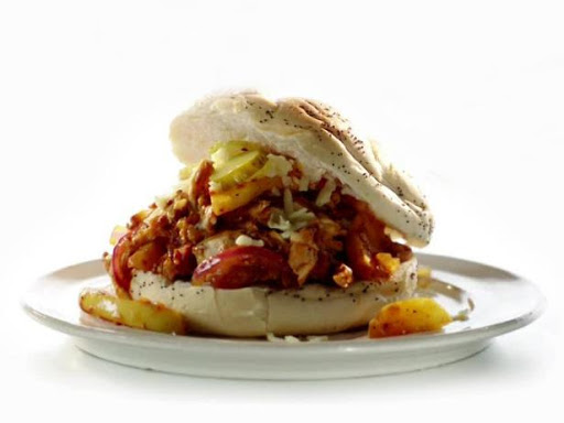 Heat a drizzle of EVOO in a large skillet over medium-high heat, add the butter and melt. Add the apples and red onions. Season with some salt, pepper and nutmeg. Cook to tender-crisp, 5 to 6 minutes. Add the chicken and sauce and combine. Cool and store for a make-ahead meal. Reheat over medium heat and serve the BBQ chicken, apples and onions on the rolls topped with cheese and pickles.