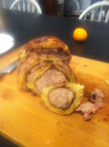 12.) Place cap back onto the duck. Using a sharp knife and significant gumption, carve the duck and crust as one dish. Julia says to “make a deep incision the length of the breast, and cut lengthwise slices angled towards the center of the duck on each side” (576). Basically, cut the duck up and down the way you would beef wellington so that you serve both meat and pastry at the same time. Enjoy! Makes 20 servings.