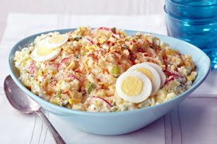 COOK potatoes in boiling water in saucepan 10 to 15 min. or until very tender; drain well. Transfer to large bowl; cool 5 min. Meanwhile, chop 3 eggs; slice remaining egg.