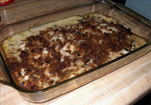 6 In saucepan, mix melted butter and 1 box of the stuffing (bread and all).