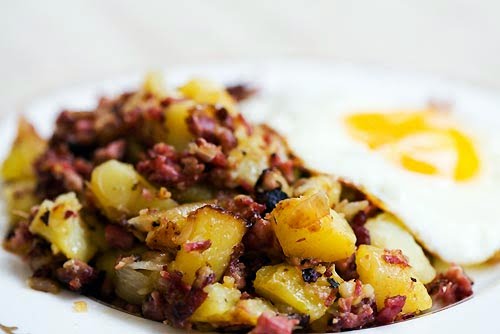 n a heavy medium skillet, heat 1 tablespoon olive oil over medium heat. Add onions and saute until softened and caramelized. Remove onions from skillet. Add remaining tablespoon oil to skillet and heat. Add diced potatoes in an even layer in the skillet, season with salt and pepper and cook until the potatoes begin to brown on the bottom, 6 to 7 minutes, shaking the pan occasionally to prevent sticking. Add onions back to skillet, press into a pancake. Season with salt and pepper.