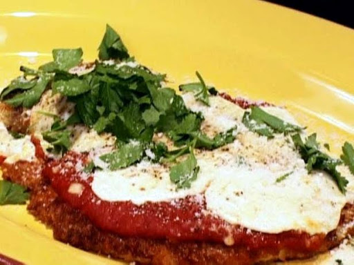 Divide the oil between 2 large saute pans and heat over high heat until almost smoking. Add 2 chicken breasts to each pan and cook until golden brown on both sides, about 2 minutes per side. Transfer to a baking sheet and top each breast with some tomato sauce, a few slices of the mozzarella, salt and pepper, and a tablespoon of Parmesan. Bake in the oven until the chicken is cooked through and the cheese is melted, about 5 to 7 minutes. Remove from the oven and garnish with basil or parsley leaves.