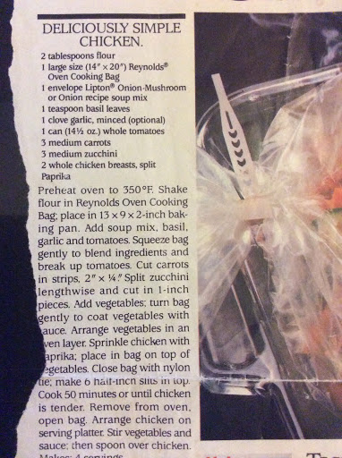 Preheat oven to 350 degrees F. Shake flour in cooking bag; place in 13x9x2 inch baking pan. Add soup mix, basil, garlic and tomatoes. Squeeze bag gently to blend ingredients and break up tomatoes.