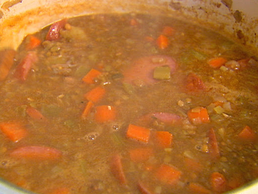 In a large stockpot over medium heat, heat the olive oil and saute the onions, leeks, garlic, salt, pepper, thyme, and cumin for 20 minutes, or until the vegetables are translucent and tender. Add the celery and carrots and saute for another 10 minutes. Add the chicken stock, tomato paste, and drained lentils, cover, and bring to a boil. Reduce the heat and simmer uncovered for 1 hour, or until the lentils are cooked through and tender. Check the seasonings. Add the kielbasa and red wine and simmer until the kielbasa is hot. Serve drizzled with olive oil and sprinkled with grated Parmesan.