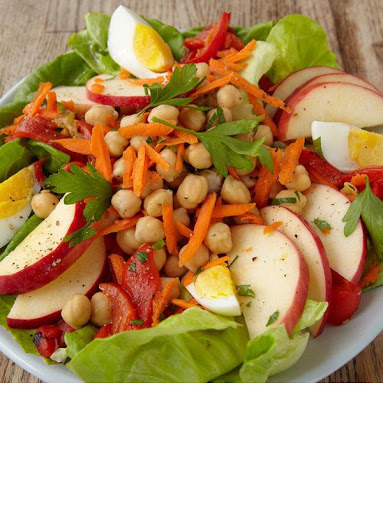 Place lettuce on a plate and top with apple, egg, rinsed and drained chickpeas, carrot and peppers; toss with vinegar and oil and season to taste.