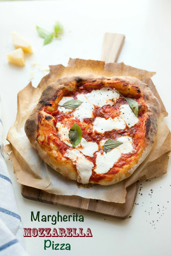 Preheat oven to 450F. On a well floured surface, roll out the pizza dough and smear a generous amount of tomato sauce. Bake for 7 minutes, then add the mozzarella pieces and bake for another 5 minutes. The pizza is ready when the edges are slightly charred and the cheese is bubbling. Add the basil leaves immediately and serve hot.