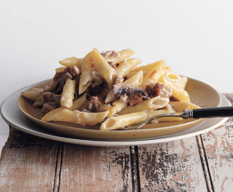 Cook penne in a pasta pot of boiling salted water (2 tablespoons salt for 6 quarts water) until al dente. Reserve 1/2 cup pasta-cooking water, then drain pasta and transfer to a flameproof 3-quart baking dish.