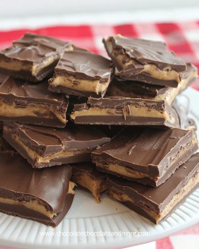 Pour remaining melted chocolate over top of peanut butter layer. Carefully spread to edges to completely cover peanut butter.