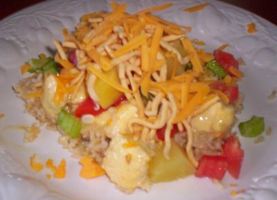 Combine soup, broth, and raw chicken chunks in slow cooker. Cook on low for 4 hours. On individual plates layer all ingredients. Stack rice, noodles, chicken, and gravy. Add tomatoes, celery, green pepper, and onion. Top with pineapple and cheese and more chicken gravy. Top with almonds.