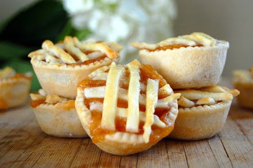 Bake the mini pies at 425 degrees for 15 minutes. I started mine at 10 minutes and kept checking them because of my oven being so small and cooking times being slightly off. 13 minutes seemed to be the magic number for me.