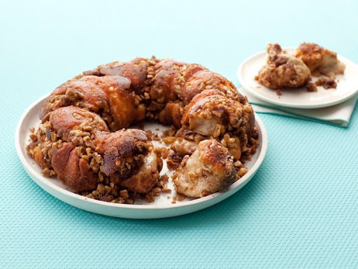Spray a bundt pan with nonstick cooking spray. Mix the granulated sugar and cinnamon. In a saucepan, melt the butter and brown sugar over low heat, stirring well; set aside. Cut the cream cheese into 20 equal cubes. Press the biscuits out with your fingers and sprinkle each with 1/2 teaspoon of cinnamon sugar. Place a cube of cream cheese in the center of each biscuit, wrapping and sealing the dough around the cream cheese. Sprinkle 1/2 cup of the nuts into the bottom of the bundt pan. Place half of the prepared biscuits in the pan. Sprinkle with cinnamon sugar, pour half of the melted butter mixture over the biscuits, and sprinkle on 1/2 cup of nuts. Layer the remaining biscuits on top, sprinkle with the remaining cinnamon sugar, pour the remaining butter mixture over the biscuits, and sprinkle with the remaining 1/2 cup of nuts. Bake for 30 minutes. Remove from the oven and cool for 5 minutes. Place a plate on top and invert.