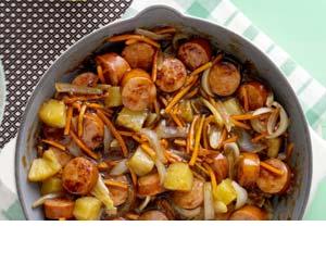 Stir-fry sausage in a large nonstick skillet for 3-4 minutes or until lightly browned. Add onions and carrots; stir-fry until crisp-tender. Drain pineapple, reserving juice. Add pineapple to sausage mixture.