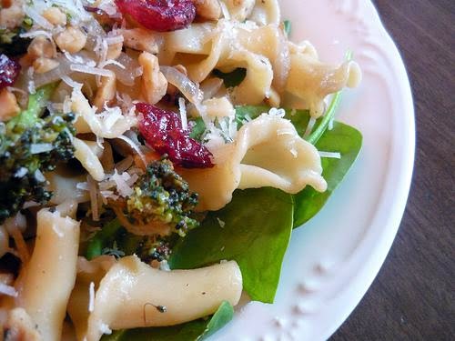Place the washed spinach on your serving platter, and top with the hot pasta. Garnish with additional cranberries, walnuts, and parmesan, and enjoy!