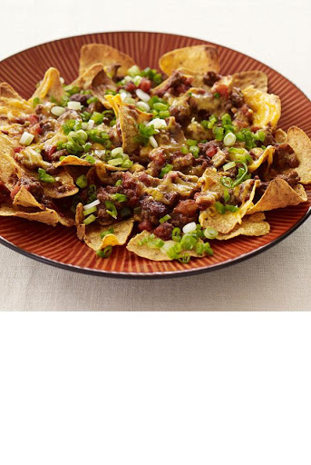 Spoon beef mixture over chips; sprinkle with cheese. Broil until cheese melts, about 30 seconds to 1 minute. Remove from broiler; sprinkle with scallions and jalapenos. Yields 4 chips with toppings per serving.