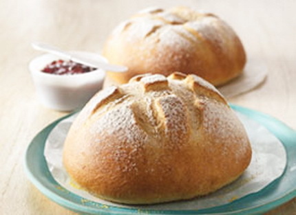 Heat oven to 375°F. Uncover dough; carefully slash tic-tac-toe pattern on each loaf top with serrated knife. Sprinkle loaf lightly with flour. Bake 20 to 25 minutes or until loaves are golden brown. Immediately remove from cookie sheet to cooling rack; cool.