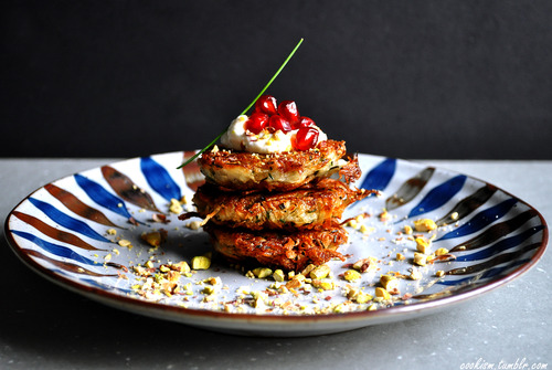 So we were sitting around, in need of some Jewish finger food to munch the lazy afternoon away. And Jerusalem answered our prayers with latkes- traditional potato pancakes eaten by the Jews on Hanukkah. These medallions of shredded potato and parsnips are fried golden like the Arabian sun, and while they are usually eaten with sour cream or yoghurt, Cookism serves it up with the unbeatable flavours of crushed pistachios and pomegranate rubies, a first in the latke world. So if its your first time making latkes, this is the recipe for you. Better latke than never!
