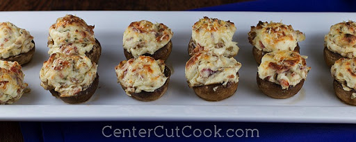 Heat 1 tablespoon olive oil in a large non-stick skillet. Sauté chopped mushroom stems and garlic for 5-10 minutes. Turn the heat to low. Stir in cream cheese, 1/4 cup parmesan cheese, crumbled bacon, red pepper flake, black pepper, onion powder, dried parsley, and a squeeze of lemon juice. Mix well.