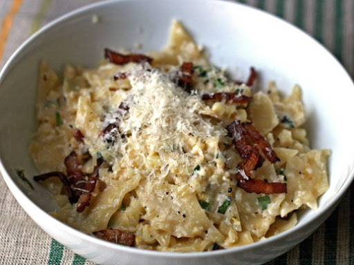 5. Divide the pasta among bowls and top with remaining basil, bacon, and freshly grated Parmesan cheese, if desired. Serve immediately.