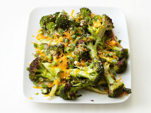 Cut 1 large head broccoli into long spears. Toss with 2 tablespoons olive oil on a baking sheet; season with salt. Roast at 450 degrees F until almost tender, 15 minutes. Toss 1/2 cup breadcrumbs (preferably panko) with 1 cup grated sharp cheddar, 1 bunch sliced scallions, 1 tablespoon olive oil and a pinch of nutmeg. Sprinkle on the broccoli and roast 15 more minutes.
