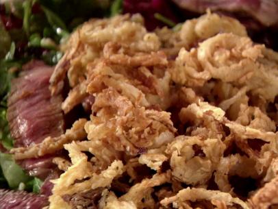 Heap the salad on a plate, making sure to get plenty of blue cheese and tomatoes on each plate. Add half a steak to the top of each plate, then top the steak with onion strings.