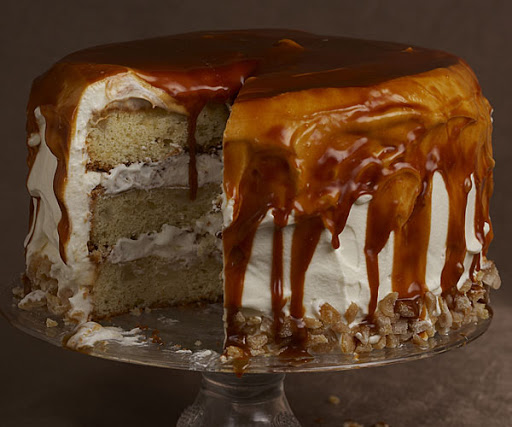 It’s a triple-decker stunner that features a soft, tender cake with fresh pears and homemade ginger folded into the batter, and a billowy whipped cream filling and frosting. All is topped with luscious rum-caramel glaze.