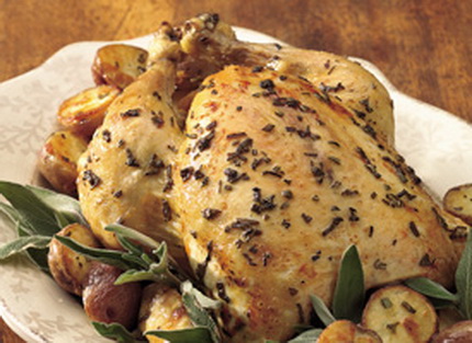 Garnish the ooh's and ahh's when you put this pretty roast chicken on the table, circled by roasted new potatoes drizzled with herbs and olive oil.