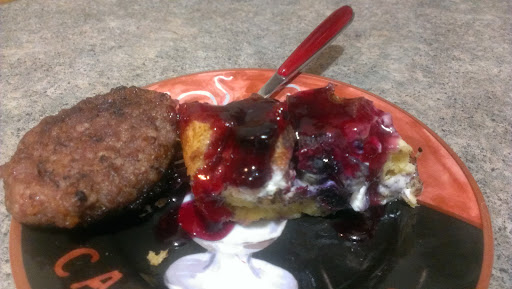 This is an excellent breakfast dish full of flavor and topped with an excellent berry sauce. Good for your everyday breakfast, brunch gatherings or those company breakfasts that you would to socialize rather than be in the kitchen cooking.