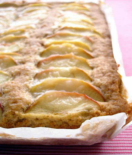 Transfer the batter to prepared pan and level the top. Arrange the apple slices on top of the batter. Brush the apples with jam and bake for 30-35 minutes, checking after 25.