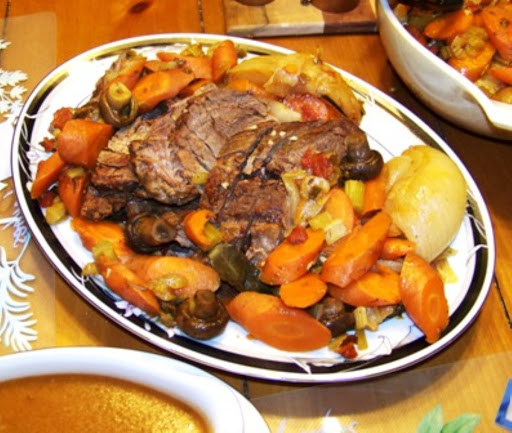 Remove the roast from the oven and carefully transfer the meat to a serving platter. Cover loosely to keep warm. Remove the vegetables with a slotted spoon, set aside in a bowl, and cover to keep warm.