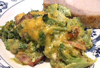 Cook the broccoli 4-5 minutes or just until tender-crisp; drain very well. Put in a greased 2-quart casserole. Mix in the cream cheese, cheddar, green onion, salt, pepper and bacon. Bake at 350º for 20-30 minutes, until bubbly.
